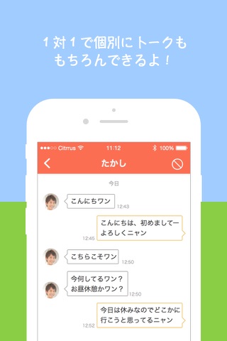 わんにゃんトークは、男の子は「わんこ」、女の子は「にゃんこ」になりきるトークアプリです!