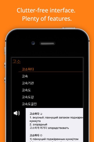 KoRusDic 사전은 다른 사전들과 차별화되어 있습니다. 필요한 기능만 시각적으로 압축하여 보여주는 디자인에 많은 시간과 노력을 투자했습니다. 사용법은 간단하지만, 필요할 때 강력한 기능을 모두 이용할 수 있습니다. 새로운 어휘 데이터베이스와 개선된 검색 알고리즘을 추가해 원어민이나 상급 학습자에게도 유용하게 만들었습니다.