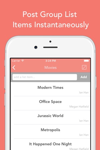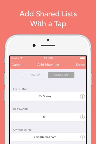 Add it to The List! Whether youre with friends or sharing between family, lists are tough to keep track of. The List app allows you to create and share lists in a flash allowing all your friends to access and update in real-time. Add movies to a "Must Watch" list or groceries to a grocery list! All for free - no in-app purchases, no limits.