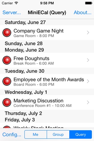 When viewing other users calendars, you can query them on an "as needed" basis, or you can set up a group of users to view all at once. In Version 1.3 of MiniECal, you can cycle through those calendars in your defined group and view them one at a time OR show them side by side in a "graphical view". You can store your groups in iCloud for easy access from all of your iPhone, iPad and iPod touch devices.