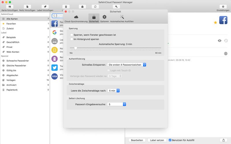 Sie können SafeInCloud sofort mit einem Fingerabdruck auf Geräten mit Touch-ID entsperren.