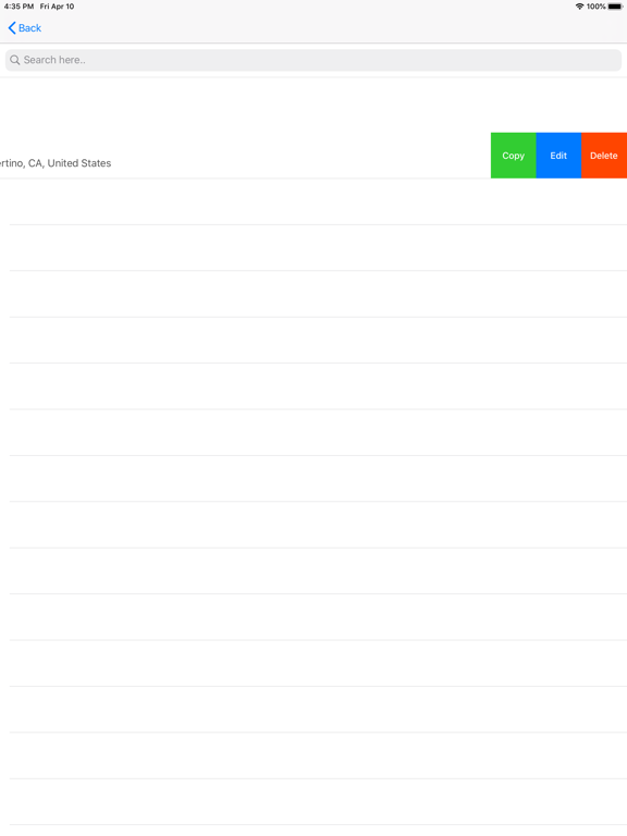Using this app you can find your postal address based on your current location. You can also save it in your address book for future access. In order to delete, edit, or copy an address to clipboard, swipe the desired row in your address book and select the appropriate action.