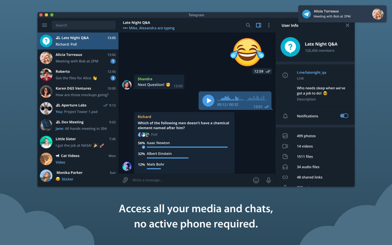 Wie alle Telegram-Apps synchronisiert sie sofort alle deine Medien und Dateien aus der Cloud und benötigt keine aktive Verbindung mit deinem Handy.